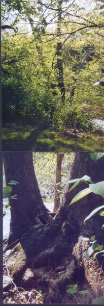 Comments: The "Three Graces"; named for three godesses of Greek mythology-Wisdom. Charm, & Beauty are sycamores. It was believed by ancient Hellenic mothers that these attributes would be bestowed upon their daughters as a reward for devotion . There are many statuary renditions of them, but they are always portrayed as standing very close to one another and sharing a common base. Our "Three Graces" are three separate and distinct trees whose root system over the years has melded into a singular, rather grostesque, large twisted mass. I guessimate their height as 80' for the shorter one, and 120' for the other two.