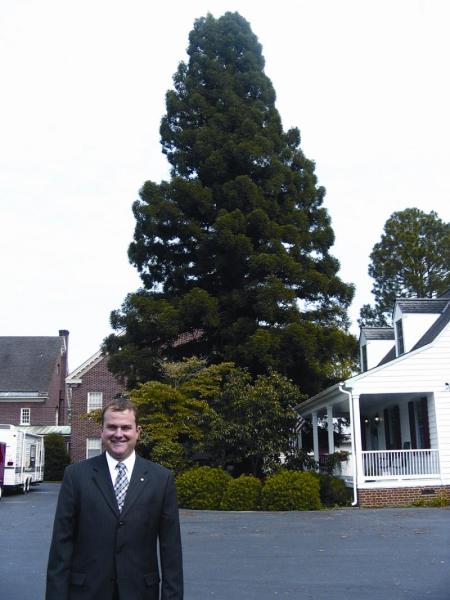Comments: This tree was measured in 2005 by Byron Carmean and Gary Williamson. The Circumference: 184; Height: 89; crown: 43; points: 284 The history of the tree: Hurricane Hazel was the worst hurricane of the 1954 Atlantic hurricane season and estimated to be one of the worst hurricanes of the 20th century. Hazel killed as many as 1,000 people in Haiti before striking the United States just south of Wilmington, North Carolina as a Category 4 hurricane; it is the strongest hurricane ever recorded to strike so far north on the U.S. East Coast. During that Hurricane my grandmother and grandfather were in California for a Funeral convention. When they heard the news of the hurricane they thought all was lost. This made my grandmother stop and dig up this tree and nurse it cross country to VA. There are two main reasons why I think it is so remarkable. First it is only 51 years old; two it is very rarely noticed. It is truly a California gentle giant growing here in VA.
